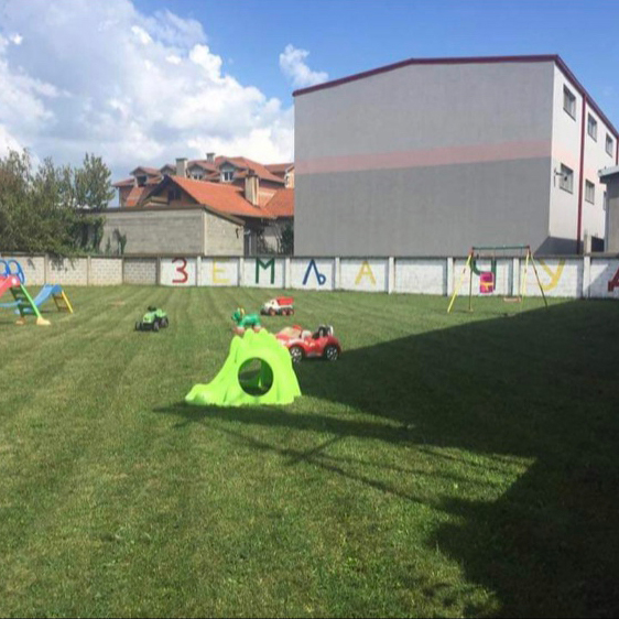 Kompletno ograđeno dvorište sa video-nadzorom na preko 150 m2 travnate površine opremljen toboganima, klackalicama, ljuljaškama i raznim dečijim igračkama.